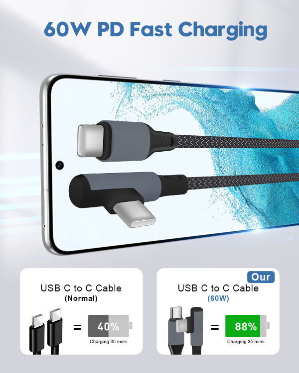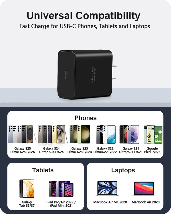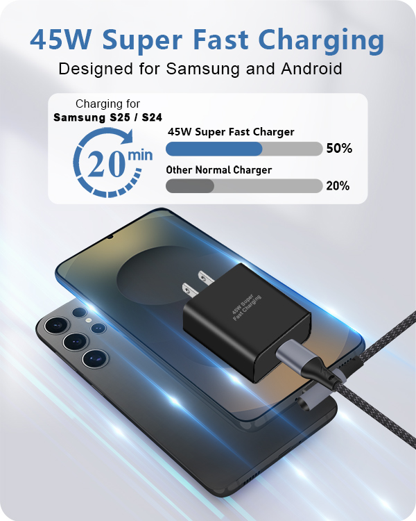 Model Number: A9T45C Manufacturer: Heyuan Chenchuang Technology Co., Ltd. 45W Samsung Charger Fast Charging: USB C charger block adopts latest PD/PPS (Programmable Power Supply) fast charging protocol to provides 45W Max output power for Samsung devices. fast charge for your Samsung Galaxy S26+/S25+ from 0% to 70% in just 30 minutes 10FT Right Angle USB C Cable: Compared to traditional smartphone charging cables, this USB C to C cable has an ergonomic 90° right Angle end "L" design, which successfully prevents wear, strain cables and connection problems, and extends the life of the charger cord. The ergonomic design makes it easier and more comfortable to play games, use apps in portrait mode, watch videos and read e-books while charging Universal Compatibility: 45W Super fast charger type c compatible with Samsung Galaxy S26, S26+, S26 Ultra, S25 Edge, S25, S25+, S25 Ultra, S24, S24+, S24 Ultra, S23, S23+, S23 Ultra, S22, S22+, S22 Ultra, S21, S21+, S21 Ultra, S21 FE, S20, S20+, S20 Ultra, S20 FE 5G, S10, S9, S8 Plus, Note 20 Ultra, Note 20, Note 10, Z Flip5, Z Fold5, Z Fold4, Z Flip4, A73, A71, A80, A90, A54, A53, A52, A23, Galaxy Tab S9, S9+, S8, S8+, W23 Flip, W23, W22, Google Pixel 8 7 6 Pro 5 4 XL, LG G8 G7 G6 V50 V40 V30, Moto, Android Phones and more Safe & Reliable: 45W Samsung fast charger block built-in smart chip and multi-protect system, protect your devices against over-voltage, over-current, over-heating and short-circuit, ensure your devices safety. Portable and compact designed, easy to carry, suitable for travel What You Get: 2-Pack 45W Super Fast USB C Wall Charger and 2-Pack 10FT Right Angle Type C Cable. 24/7 Friendly customer service