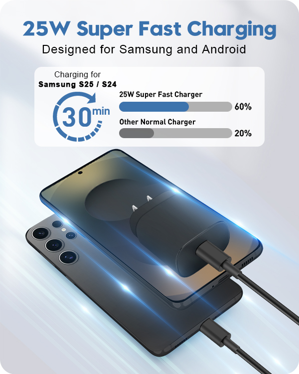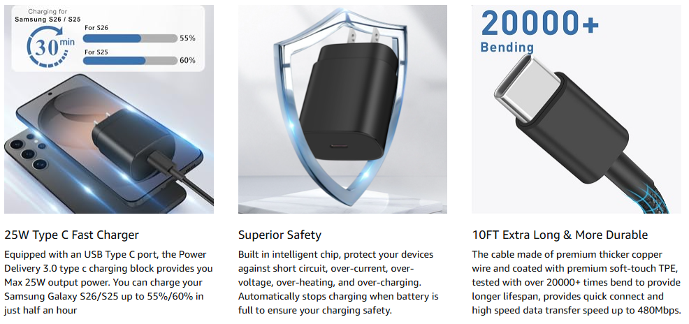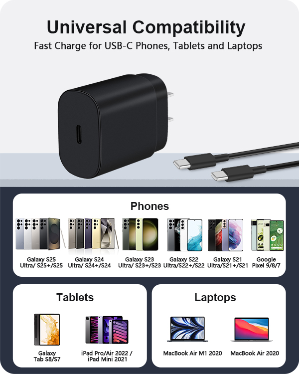 Model Number: CZ2P5DS Manufacturer: Shenzhen Dipinle Technology Co., Ltd. 25W Super Fast Charger: USB C charger block adopts latest PD/PPS (Programmable Power Supply) fast charging protocol to provides 25W Max output power for Samsung devices. Charge Samsung Galaxy S26/S25 from 0% to 55%/60% in 30 minutes Universal Compatibility: 25W Type C super fast charging block compatible with Samsung Galaxy S26, S26+, S26 Ultra, S25, S25+, S25 Ultra, S24, S24+, S24 Ultra, S23, S23+, S23 Ultra, S22, S22+, S22 Ultra, S21, S21+, S21 Ultra, S21 FE, S20, S20+, S20 Ultra, S20 FE 5G, S10, S9, S8 Plus, Note 20 Ultra, Note 20, Note 10, Z Flip6, Z Fold6, Z Fold5, Z Flip5, A73, A71, A80, A90, A54, A53, A52, Galaxy Tab S9, S9+, S8, S8+, W23, W22, Google Pixel 9 8 7 6 Pro 5 4 XL, LG G8 G7 G6 V50 V40, Moto, Android Phones and more 10FT Extra Long Cable: USB C charger cord supports 60W/3A fast charging and up to 480Mbps data sync transfer speed. The 10ft long length designed allows you to use phones in the sofa, bedroom and even the back seat of the car. 20000+ bending lifespan test, stronger durability and longer service life Safe & Reliable: The USB-C wall charger has built-in multiple safety protection systems to protect your device against short circuit, overcharging and overheating issues. Smart IC chip can automatically identify and detect the type of phone and battery status, automatically stop charging when the battery is fully charged, make your device safe What You Get: 2-Pack 25W Type C Super Fast Charger Block; 2-Pack 10FT Long USB C to USB C Cable. Suitable for family, friends and travel
