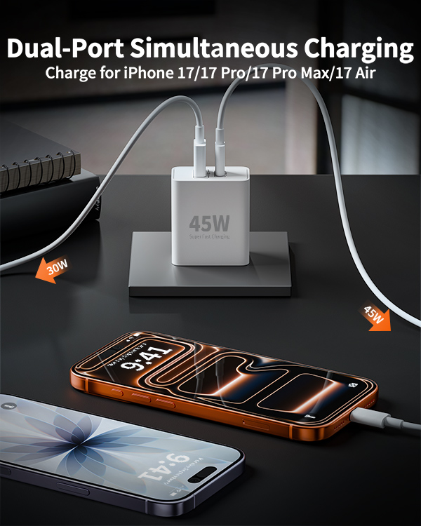 45W Fast Charging for iPhone 17: WODENTA USB C charger block adopts the 2025 upgraded PD 3.0 fast charging technology, with a maximum output power of 45W. Charge for your iPhone 17 series up to 50% in just 20 minutes. It can also fast charge for your iPad, Watch, AirPods, Android Phones, and other USB-C devices Dual-Port Simultaneous Charging: This 45W fast charging block is equipped with USB-C and USB-A ports and can charge your iPhone and iPad series two devices simultaneously, helping you work efficiently. The 45W dual-port USB C power adapter offers fast and efficient charging at home, in the office or on the go 10FT Long iPhone 17 Charger Cord: This USB-C cable supports PD3.0 fast charging with a maximum output power of 60W (20V/3A) and data transfer speed of up to 480Mbps. The 10-foot extra long length design makes it convenient for you to charge from a distance on the sofa, in the bedroom, in the office, or even while playing entertainment videos and games Widely Compatibility: The 45W USB-C & USB-A wall charger is compatible with mobile phones, tablets, laptops, smart watches, and other USB-C and USB-A devices. Compatible with iPhone 17/17 Air/17 Pro/17 Pro Max/16/16 Plus/16 Pro/16 Pro Max/16e/15/15 Plus/15 Pro/15 Pro Max, iPad Pro 13/12.9/11 inch, iPad Air 6th/5th/4th, iPad Mini 6th, iPad 10th Generation/A16, Samsung Galaxy S25/S24/S23/S22/S21, Moto, Pixel, LG, Android and more What You Get: 2 x 45W Dual Port USB C Wall Charger Block (White), 2 x 10FT USB C to USB C Cable (White). Carry a 45W fast USB-C charger kit with you to make you don't run out of power when you need it most