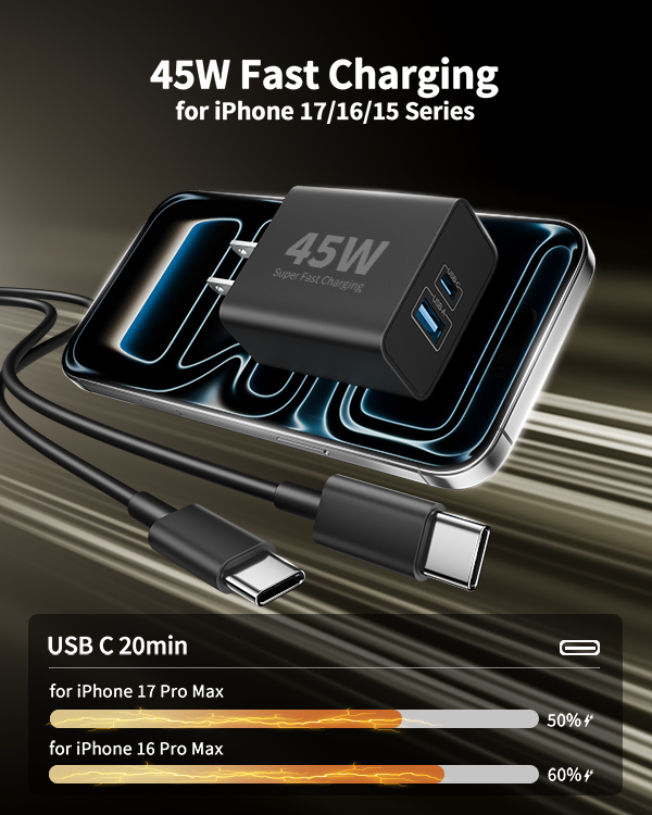 The USB C charger block adopts the 2025 upgraded PD 3.0 fast charging technology, with a maximum output power of 45W. Charge for your iPhone 17 series up to 50% in just 20 minutes. It can also fast charge for your iPad, Watch, AirPods, Android Phones, and other USB-C devices