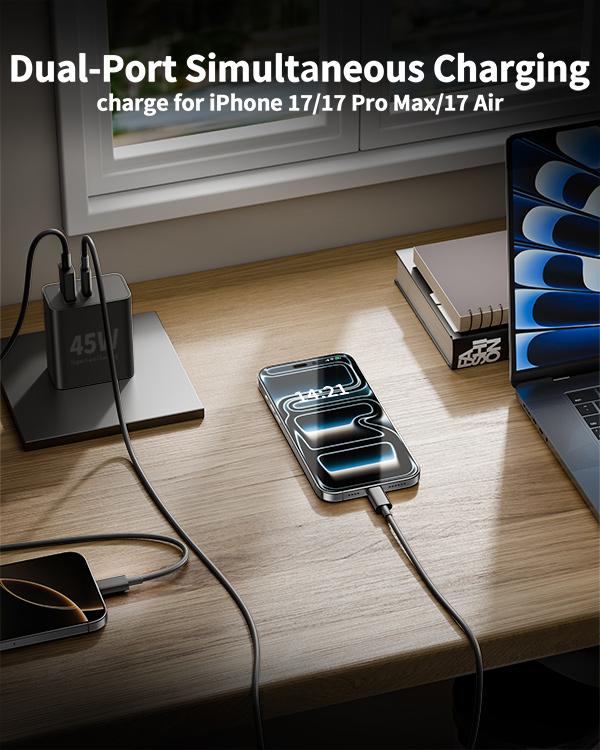 This 45W iPhone 17 fast charging block is equipped with USB-C and USB-A ports and can charge your iPhone and iPad series two devices simultaneously, helping you work efficiently
