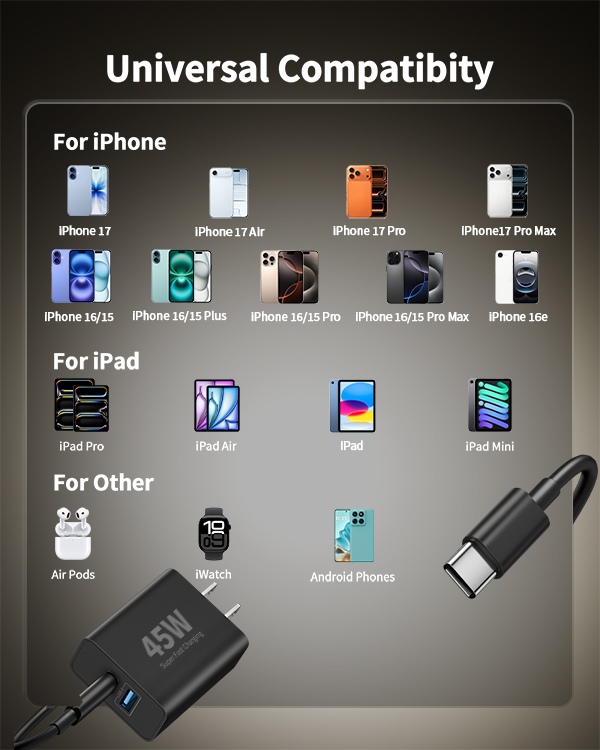 The 45W USB-C & USB-A wall charger is compatible with mobile phones, tablets, laptops, smart watches, and other USB-C and USB-A devices. Compatible with iPhone 17/17 Air/17 Pro/17 Pro Max/17e/16/16 Plus/16 Pro/16 Pro Max/16e/15/15 Plus/15 Pro/15 Pro Max, iPad Pro 13/12.9/11 inch, iPad Air 6th/5th/4th, iPad Mini 6th, iPad 10th Generation/A16, Samsung Galaxy S26/S25/S24/S23/S22/S21, Moto, Pixel, LG, Android and more