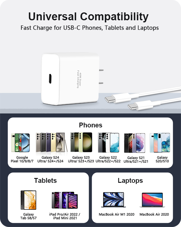 Model Number: A9T45C Manufacturer: Heyuan Chenchuang Technology Co., Ltd. 45W Fast Charger for Pixel 10 9 8: Enjoy fast charging with 45W Max output for your Google Pixel 10/9/8 Series. Charge for your Pixel 10 up to 70% in just 30 minutes. It can also fast charge for your iPhone 17 series, iPad series, Android Phones, and other USB-C devices 10FT Long Pixel Charger Cord: This USB-C cable supports PD3.0 fast charging with a maximum output power of 60W (20V/3A) and data transfer speed of up to 480Mbps. The 10-foot extra long length design makes it convenient for you to charge from a distance on the sofa, in the bedroom, in the office, or even in the backseat of your car Safe & Reliable: 45W Pixel fast charger built-in intelligent IC chip, can automatically identify your Pixel devices, multiple security protection system to prevent overheating, overcharge, over-voltage, over-current and short circuit, to make the safety of your connected device Widely Compatibility: The 45W USB-C fast charger compatible with Google Pixel 10/10 Pro/10 Pro XL/10 Pro Fold/9/9 Pro/9 Pro XL/9 Pro Fold/8/8a/8 Pro/7/7a/7 Pro/6/5/4 XL, Pixel Tablet, Pixel Slate, Pixelbook Go, Pixelbook, iPhone 17/17 Pro/17 Pro Max/Air/16/16 Pro Max/15/15 Pro Max/Plus, iPad, Galaxy S25/S24/S23 Ultra, Moto, LG, Tablet, Android and more What You Get: 1 x 45W USB C Wall Charger Block, 1 x 10FT Long USB C to USB C Cable. We offer 18-months replacement, 24/7 friendly customer services. 45W USB C Pixel charger offers fast and efficient charging at home, in the office or on the go