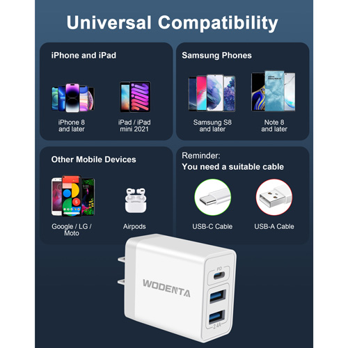One for All: with totally 32W 3-Port designed (1X USB-C + 2X USB-A), USB Power Adapter can charge 3-devices at high speed simultaneously (needed suitable USB cords). Save your time and outlet space. The USB-C Port [Max 20W]: PD Power Delivery USB C Charger Block, Charging speed up to 3X faster than standard 5W charger, charge for iPhone 14 / 13 from 0 to 50% in just 30 mins (Fast charging for iPhone 14 / 14 Plus / 14 Pro / 14 Pro Max / 13 / 12 / 11 / XS / X / XR / 8 Series, Google Pixel , Samsung and More). Dual USB-A Ports [Max 12W]: USB Wall Charger Adapter charge for iPhone / iPad / Samsung Galaxy S22 / S21 / S20 / S10 / S9 / S8, Note series, LG, Moto, Tablet, Android Phones more. Safe & Reliable: Type C Wall Charger with upgraded safety system ensures complete protect your devices. Automatically to prevent from over-heat, over-current and short circuit. Built-in smart chip to match the maximum charging speed required by devices. What You Get: 2 X 32W 3Ports USB C Charger Block, and friendly
