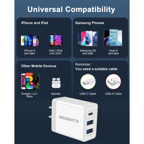 One for All: with totally 32W 3-Port designed (1X USB-C + 2X USB-A), USB Power Adapter can charge 3-devices at high speed simultaneously (needed suitable USB cords). Save your time and outlet space. The USB-C Port [Max 20W]: PD Power Delivery USB C Charger Block, Charging speed up to 3X faster than standard 5W charger, charge for iPhone 14 / 13 from 0 to 50% in just 30 mins (Fast charging for iPhone 14 / 14 Plus / 14 Pro / 14 Pro Max / 13 / 12 / 11 / XS / X / XR / 8 Series, Google Pixel , Samsung and More). Dual USB-A Ports [Max 12W]: USB Wall Charger Adapter charge for iPhone / iPad / Samsung Galaxy S22 / S21 / S20 / S10 / S9 / S8, Note series, LG, Moto, Tablet, Android Phones more. Safe & Reliable: Type C Wall Charger with upgraded safety system ensures complete protect your devices. Automatically to prevent from over-heat, over-current and short circuit. Built-in smart chip to match the maximum charging speed required by devices. What You Get: 2 X 32W 3Ports USB C Charger Block (Black,White), and friendly customer services.