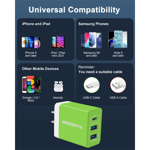 One for All: with totally 32W 3-Port designed (1X USB-C + 2X USB-A), USB Power Adapter can charge 3-devices at high speed simultaneously (needed suitable USB cords). Save your time and outlet space. The USB-C Port [Max 20W]: PD Power Delivery USB C Charger Block, Charging speed up to 3X faster than standard 5W charger, charge for iPhone 14 / 13 from 0 to 50% in just 30 mins (Fast charging for iPhone 14 / 14 Plus / 14 Pro / 14 Pro Max / 13 / 12 / 11 / XS / X / XR / 8 Series, Google Pixel , Samsung and More). Dual USB-A Ports [Max 12W]: USB Wall Charger Adapter charge for iPhone / iPad / Samsung Galaxy S22 / S21 / S20 / S10 / S9 / S8, Note series, LG, Moto, Tablet, Android Phones more. Safe & Reliable: Type C Wall Charger with upgraded safety system ensures complete protect your devices. Automatically to prevent from over-heat, over-current and short circuit. Built-in smart chip to match the maximum charging speed required by devices. What You Get: 2 X 32W 3Ports USB C Charger Block (Blue,Green), and friendly customer services.