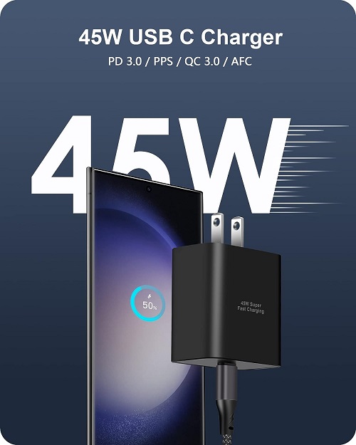 【45W Samsung Super Fast Charger】45W Type C Fast Charger adopts latest PPS (Programmable Power Supply) fast charging protocol to provides 45W Max output power for Samsung devices. Super fast charge for Samsung Galaxy S23/S22 Ultra from 0% to 50% in just 20 minutes, more faster than other 25W/15W chargers. 【10FT Long USB C to USB C Cable】The android phone charger block kit is equipped with 60W USB-C to USB-C cable, 480Mbps sync data and transfer files, and you can use any other usb c charger to charge your mobile phone, tablet and laptop. The 10ft long designed allows you to use phones in the sofa, bedroom and even the back seat of the car. Use reinforced nylon woven jacket material to ensure that metal parts will not break, 20000+bending life test. 【45W USB-C Fast Charger Compatibility 】45W Super fast charging 2.0 max compatible with Samsung Galaxy S23, S23+, S23 Ultra, S22, S22+, S22 Ultra, Note 10+, A91 and more latest models. 25W Super fast charging 1.0 max compatible with Samsung Galaxy S21, S21+ 5G, S21 Ultra, S20, S20+, S22 Ultra, S20 FE, Note 10/Note 10 5G, Galaxy Z Flip 4/Z Fold 4, Galaxy Z Fold 3 5G, A90 5G, A80, A70, Tab S8/S8+/S8 Ultra/S7+/S7 and more. 【Safe & Reliable】45W Type C Fast charging blocks bulit-in smart chip and multi-protect system, protect your devices against over-voltage, over-current, over-heating and short-circuit, ensure your devices safety. Portable and compact designed, easy to carry, suitable for travel and family. 【What You Get】2 X 45W USB C Wall Charger Block, 2 X 10FT Extra Long USB-C to USB-C Fast Charging Cord, and 24h/7d friendly customer service.