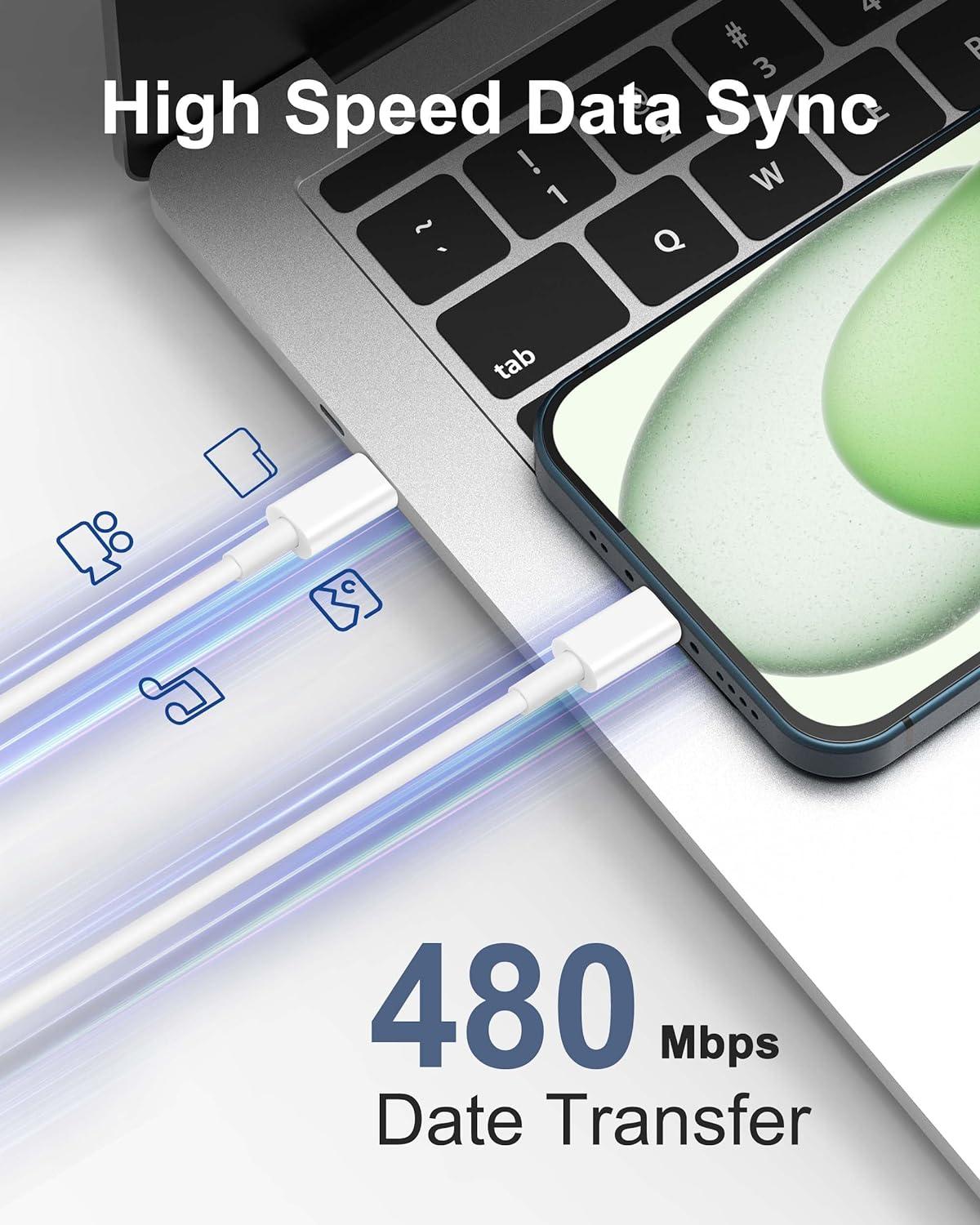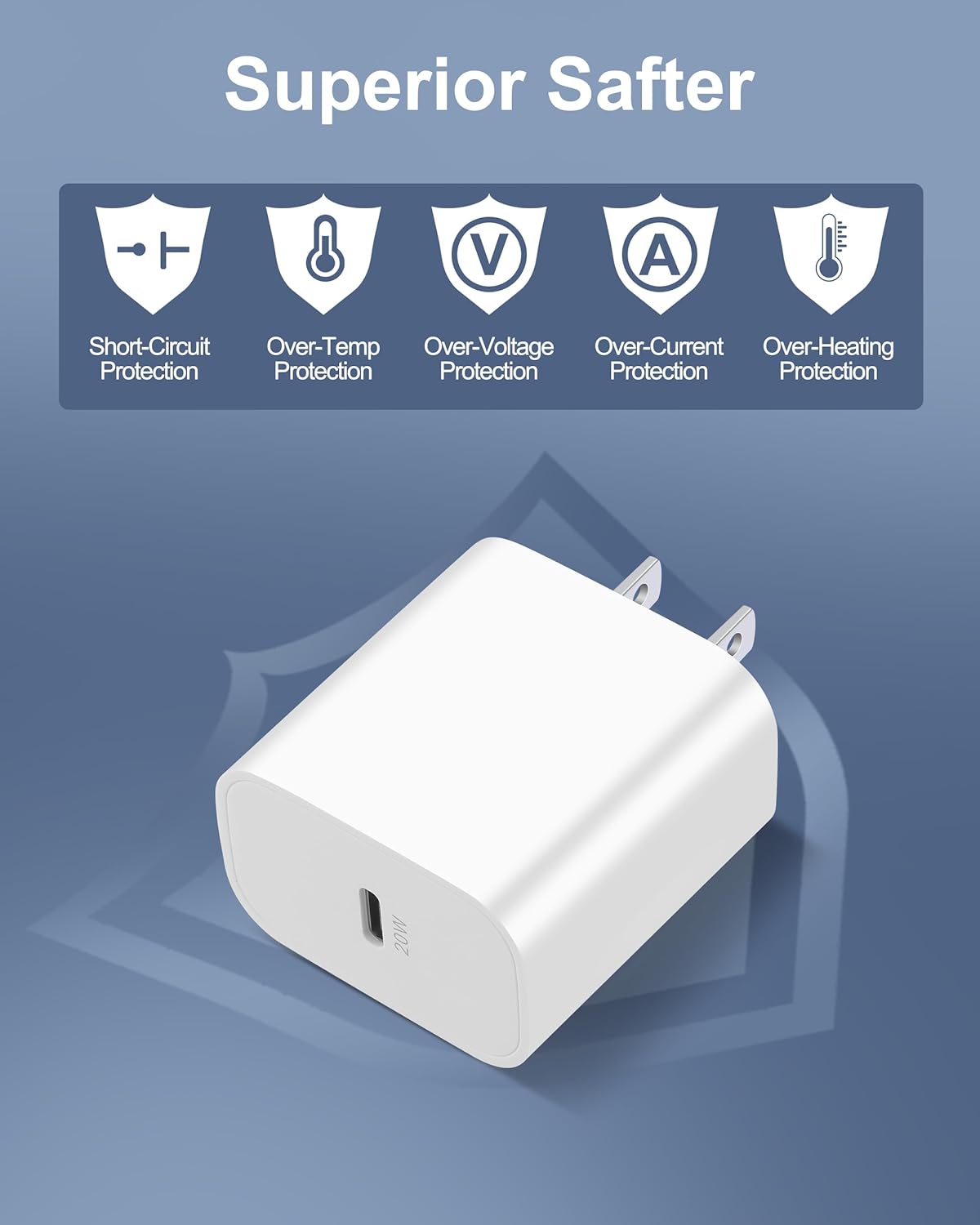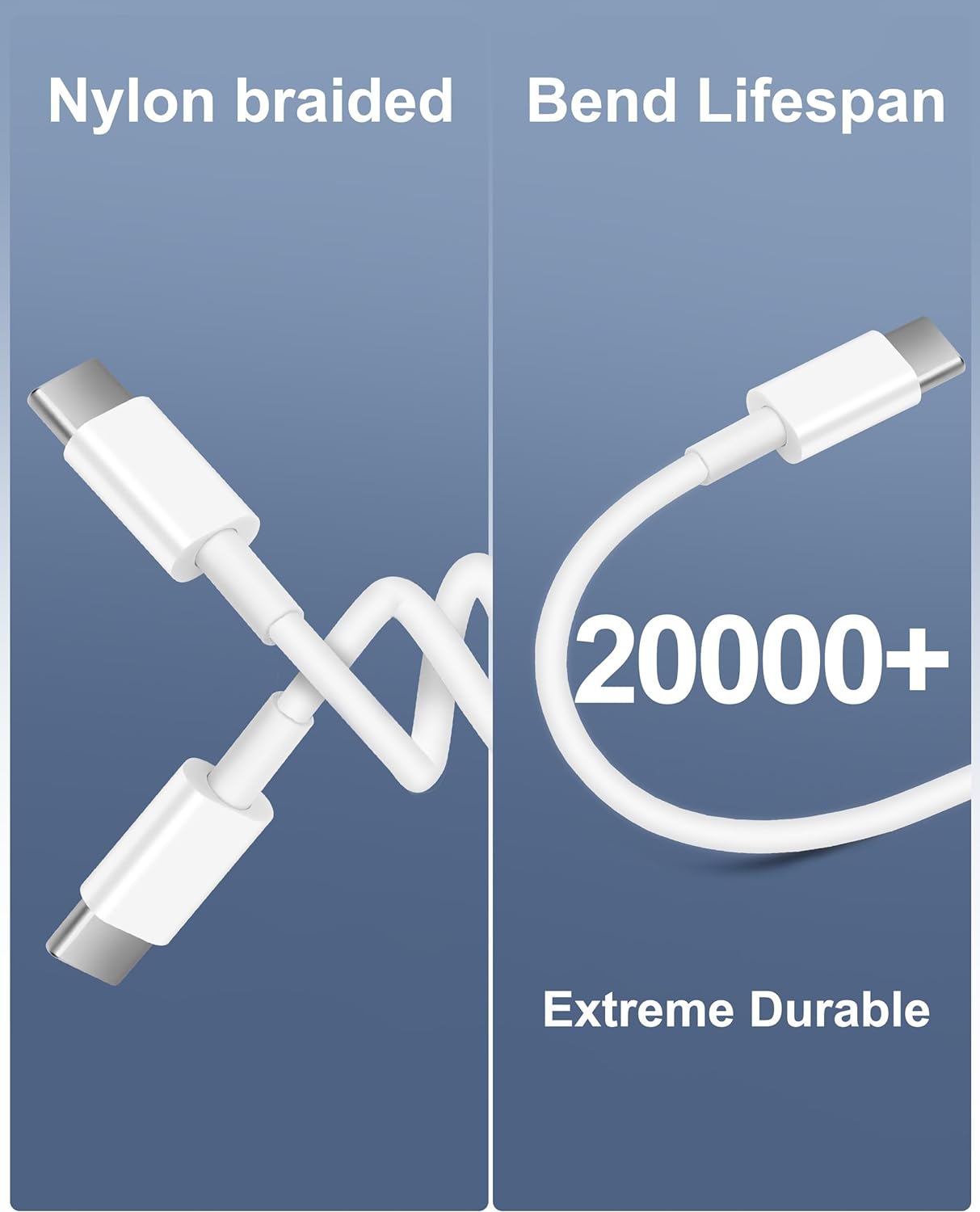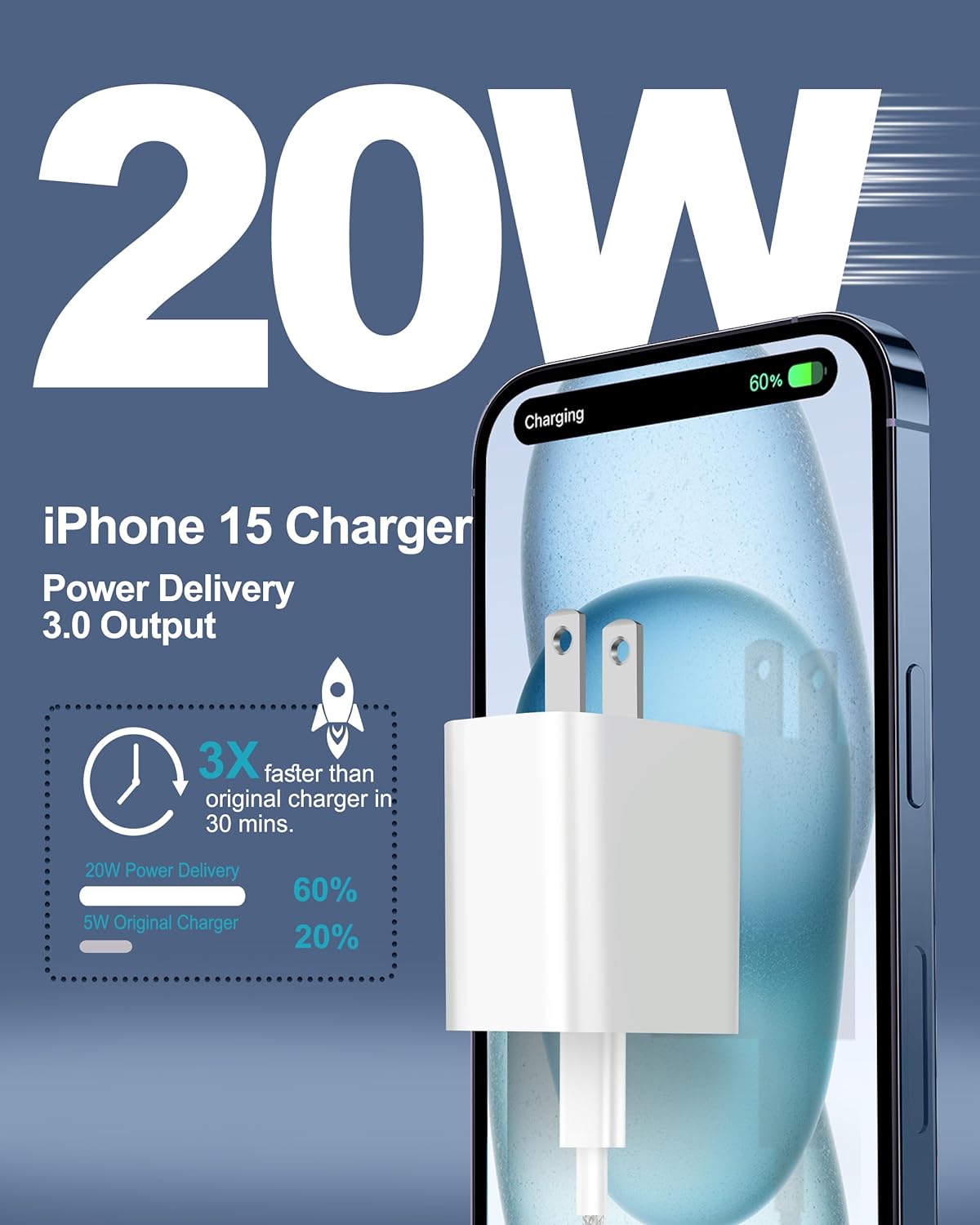 【20W iPhone 15 Fast Charging】 USB C wall charger block equipped with PD 3.0 technology provides max 20W power output, fast charge for your new iPhone 15 from 0% to 50% in just 30 minutes, saving you about 1 hour. 【For New iPhone and iPad】 The 20W USB C Charger fast charge for iPhone 15/15 Pro/15 Pro Max/15 Plus, iPad Pro 12.9 inch 6th/5th/4th/3rd Gen, iPad Pro 11 inch 6th/5th/4th/3rd Gen, iPad Air 5th, iPad Air 4th, iPad Mini 6th Gen, iPad 10th Gen, also fast charge for Google Pixel 8/8 Pro/7/7 Pro/6/6 Pro/5/4 XL, Samsung Galaxy S23/S22/S21 Ultra/S20, Note 20/Note 10. 【iPhone 15 Fast Charger Cord】 Friendly reversible design, tangle-free 6FT USB-C to USB-C cable convenient to charge your device in bedroom, office and travel. The type c to type c cable made of premium thicker copper wire and coated with premium soft-touch TPE, tested with over 20000+ times bend to provide longer lifespan, and it provides quick connect and high speed data transfer speed up to 480Mbps, helps you work efficiently. 【Safe & Reliable】 USB C power adapter with built-in safeguards can monitor temperature, voltage in time, protect your devices against overheating, over-voltage, over-current, short-circuiting, and the type c fast charging block will automatically stop charging when power is full to protect your device and ensure the safe charging overnight. 【What You Get】 1x 20W USB C Charger Block and 1x 6FT USB C to USB C Charger Cable.