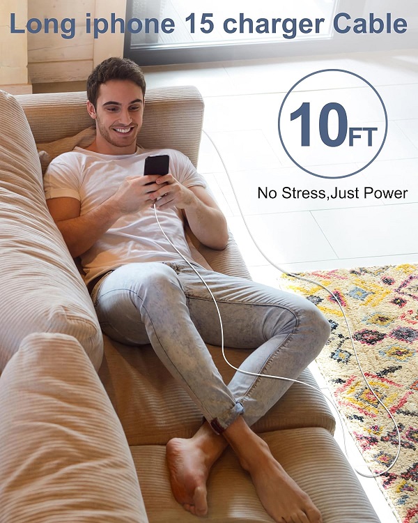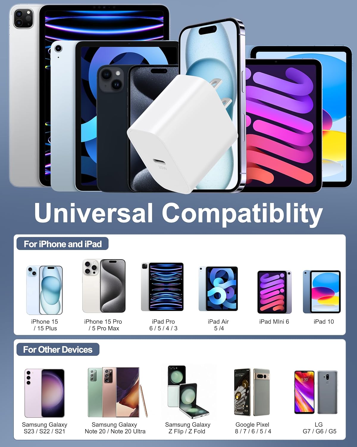 【20W iPhone 15 Fast Charging】 USB C wall charger block equipped with PD 3.0 technology provides max 20W power output, fast charge for your new iPhone 15 from 0% to 50% in just 30 minutes, saving you about 1 hour. 【For New iPhone and iPad】 The 20W USB C Charger fast charge for iPhone 15/15 Pro/15 Pro Max/15 Plus, iPad Pro 12.9 inch 6th/5th/4th/3rd Gen, iPad Pro 11 inch 6th/5th/4th/3rd Gen, iPad Air 5th, iPad Air 4th, iPad Mini 6th Gen, iPad 10th Gen, also fast charge for Google Pixel 8/8 Pro/7/7 Pro/6/6 Pro/5/4 XL, Samsung Galaxy S23/S22/S21 Ultra/S20, Note 20/Note 10. 【iPhone 15 Fast Charger Cord】 Friendly reversible design, tangle-free 10FT Long USB-C to USB-C cable convenient to charge your device in bedroom, office and travel. The type c to type c cable made of premium thicker copper wire and coated with premium soft-touch TPE, tested with over 20000+ times bend to provide longer lifespan, and it provides quick connect and high speed data transfer speed up to 480Mbps, helps you work efficiently. 【Safe & Reliable】 USB C power adapter with built-in safeguards can monitor temperature, voltage in time, protect your devices against overheating, over-voltage, over-current, short-circuiting, and the type c fast charging block will automatically stop charging when power is full to protect your device and ensure the safe charging overnight. 【What You Get】 1x 20W USB C Wall Charger Block and 1x 10FT Long USB C to USB C Cable.