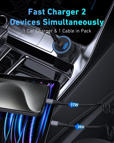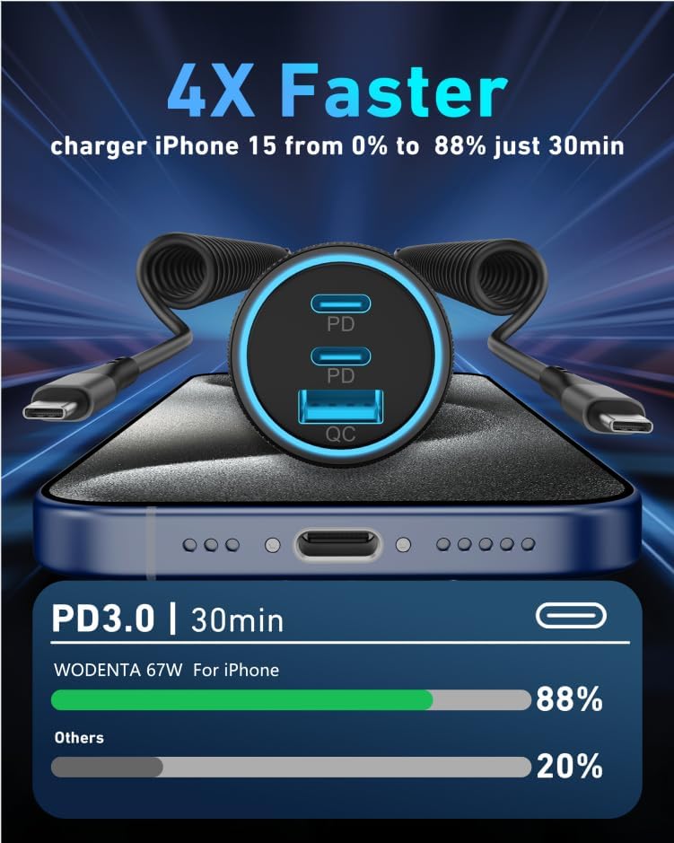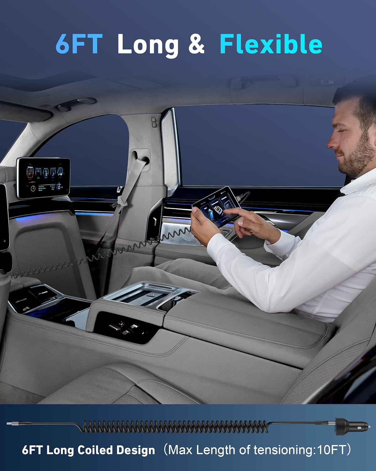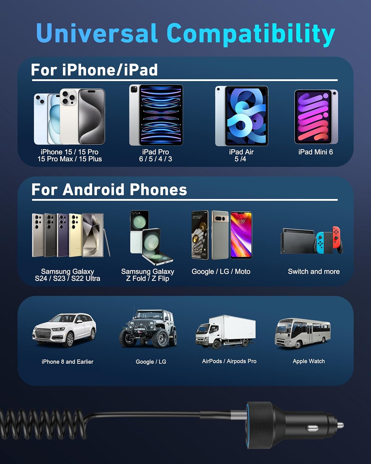 【66W Super Fast Charging】USB C super fast car charger with all-new upgrade 66W can charge your iPhone 15/14/13/12 series up to 80% and iPad up to 60% at 30 minutes. Type c car charger adapter also fast charge for Samsung S24/S23/S22 series up to 60% in just 20 minutes. 3-Port Simultaneous Charging】USB C car phone charger equipped with two USB-C ports and one USB-A port, it can charge up to 3 devices simultaneous, with a total output of 67W. The car charger supports PD 36W (Max) and QC 30W (Max) high output, can fast charge all prevailing phones and electronic devices. 【6FT Coiled USB C to C Cable】 Retractable charging cable is designed with a spring shape, no knots, no tangles, occupy little space. The 6FT Type C coiled cable with friendly reversible design, 20000+ bend lifespan. Supports 480Mbps data transfer and 60W power charging. 【Universal Compatibility】66W USB C car charger with 6FT Coiled USB C Cable fast charge for iPhone 15/15 Plus/15 Pro/15 Pro Max, iPad Pro 12.9/11 inch, iPad Air 5/4th, iPad Mini 6, iPad 10th, Samsung Galaxy S24/S23/S23/S22/S21/S20/S10/S9/S8/A12/A13/A22/A32/A52/A53/A71, Note 20 10 9, LG G8 G7 G6 V50 V40, Google Pixel 8/7/6 /5/4 XL, Android Phones and more. 【What Yor Get】 1-Pack 66W USB C Car Charger Adapter, 1-Pack 6FT Coiled USB-C to C Cable. Compatible with 12-24V cars (Cars, SUVs, Trucks, etc). Ideal for travel or on the go. Carry a 66W fast car charger kit with you to ensure you don't run out of power when you need it most.