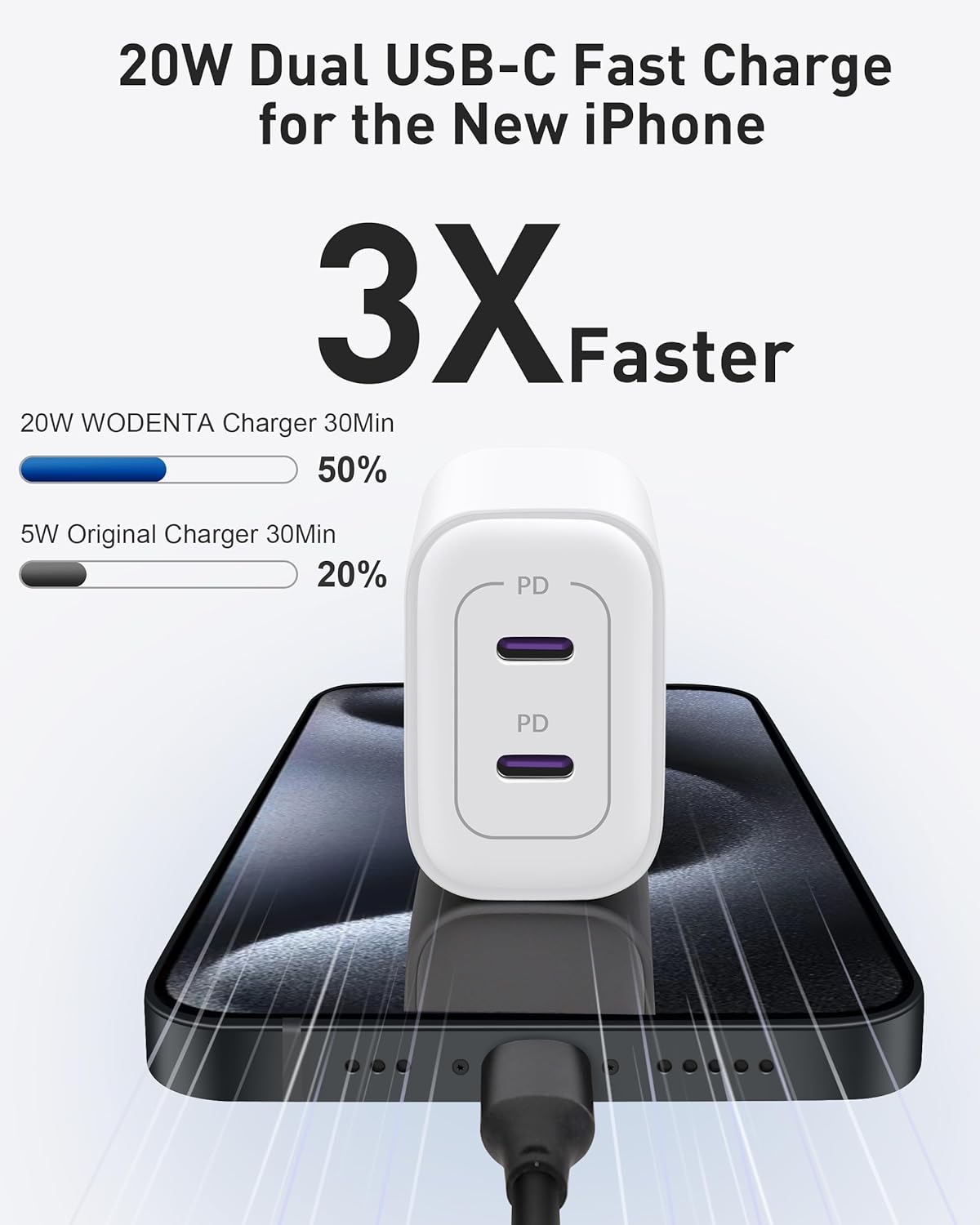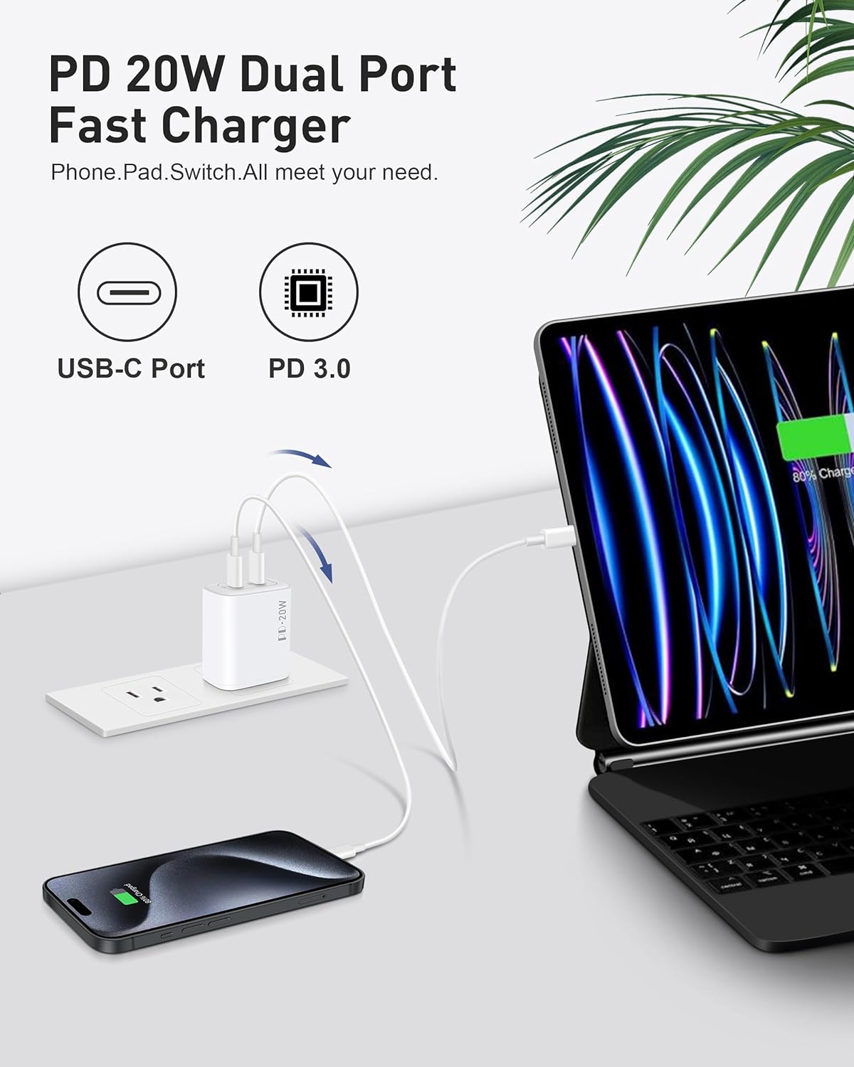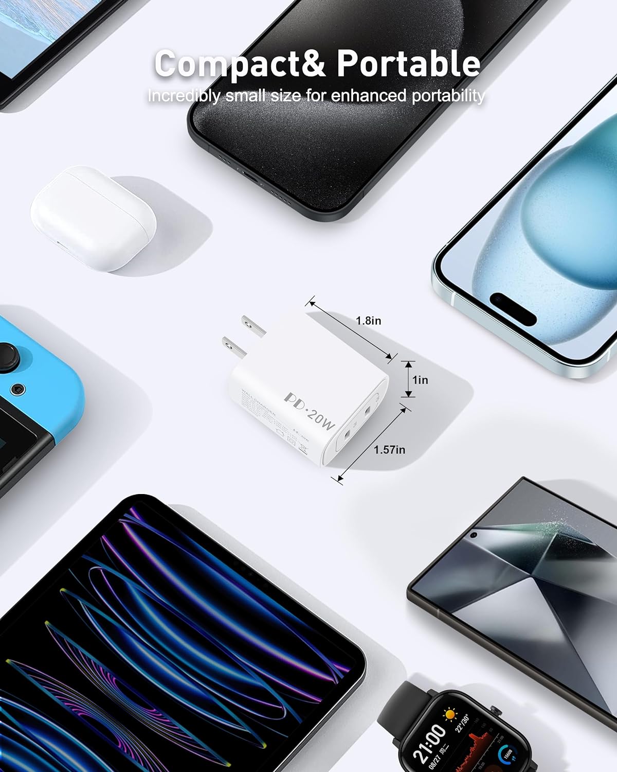 【3Pack 20W Fast Charger Block】 USB C charger block provides fast and efficient charging up to 3X faster than the original charger. Charge your iPhone 15 up to 50% capacity in just 30 minutes. 【Dual Port High-Speed Charging】 The USB C wall charger supports a maximum power output of 20W. Adopting dual USB-C port design, charge 2 devices simultaneously to minimize waiting time and frees you from messy chargers with various interfaces. 【Universal Compatibility】 2Pack 20W Dual USB C charger block compatible with iPhone 15/15 Pro /15 Pro Max/15 Plus, iPad Pro 12.9 inch/11 inch 6th/5th/4th/3rd Gen, iPad Air 5th/4th, iPad Mini 6th Gen, iPad 10th Gen. Also works for Samsung Galaxy S24/S23/S22/S21 Ultra/S20/S10/S9/S8 Plus, Note 20/10, Google Pixel 8/8 Pro/7/7 Pro/6/6 Pro /5/5a/4/4 XL, LG, Moto, Android Phones and more. 【Safe & Reliable】The 20W USB C power adapter plug adopts intelligent charging protection technology, built-in multi safeguards protect your devices against over-charging, over-voltage, over-heat and short-circuit. The type c charger automatically stops charging when fully charged, ensure the safety of connected devices. 【Compact & Portable】Lightweight, compact, space saving and easy to fit into bags and pockets. Carry the 20W Dual USB C charger box brick cube with you to make sure you don't run out of power when you need it most. Ideal for travel, home, office, or on the go.