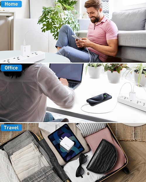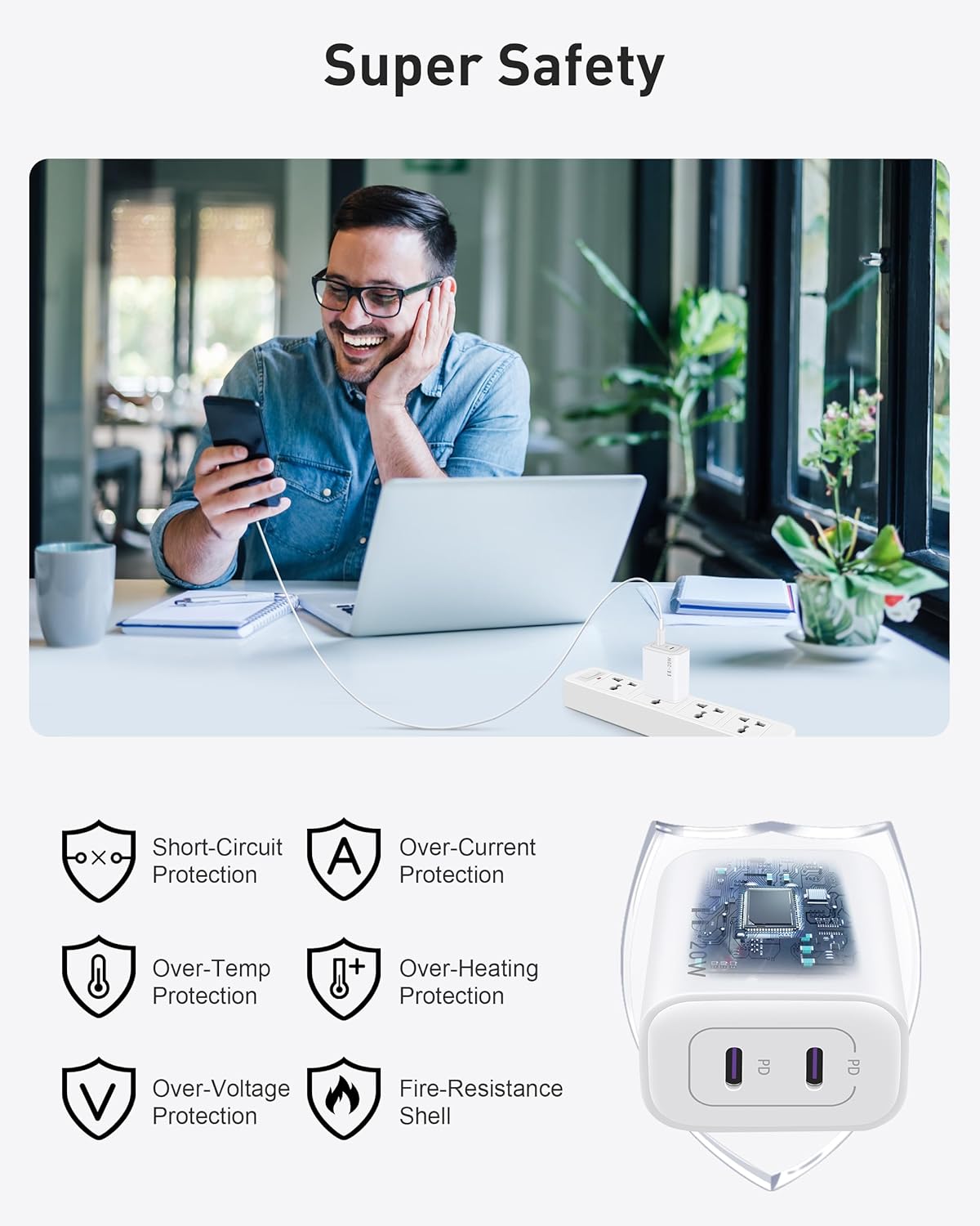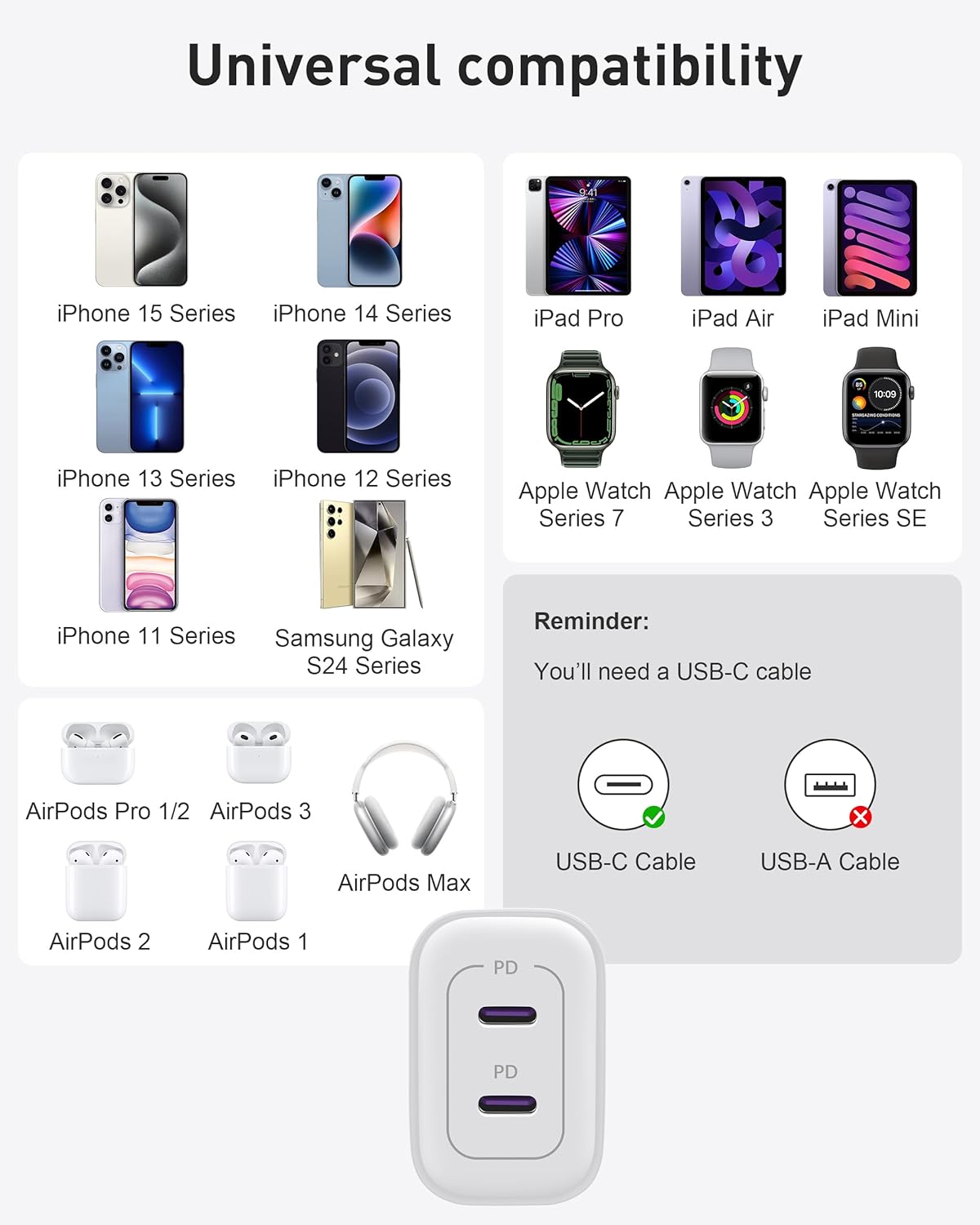 【3Pack 20W Fast Charger Block】 USB C charger block provides fast and efficient charging up to 3X faster than the original charger. Charge your iPhone 15 up to 50% capacity in just 30 minutes. 【Dual Port High-Speed Charging】 The USB C wall charger supports a maximum power output of 20W. Adopting dual USB-C port design, charge 2 devices simultaneously to minimize waiting time and frees you from messy chargers with various interfaces. 【Universal Compatibility】 2Pack 20W Dual USB C charger block compatible with iPhone 15/15 Pro /15 Pro Max/15 Plus, iPad Pro 12.9 inch/11 inch 6th/5th/4th/3rd Gen, iPad Air 5th/4th, iPad Mini 6th Gen, iPad 10th Gen. Also works for Samsung Galaxy S24/S23/S22/S21 Ultra/S20/S10/S9/S8 Plus, Note 20/10, Google Pixel 8/8 Pro/7/7 Pro/6/6 Pro /5/5a/4/4 XL, LG, Moto, Android Phones and more. 【Safe & Reliable】The 20W USB C power adapter plug adopts intelligent charging protection technology, built-in multi safeguards protect your devices against over-charging, over-voltage, over-heat and short-circuit. The type c charger automatically stops charging when fully charged, ensure the safety of connected devices. 【Compact & Portable】Lightweight, compact, space saving and easy to fit into bags and pockets. Carry the 20W Dual USB C charger box brick cube with you to make sure you don't run out of power when you need it most. Ideal for travel, home, office, or on the go.