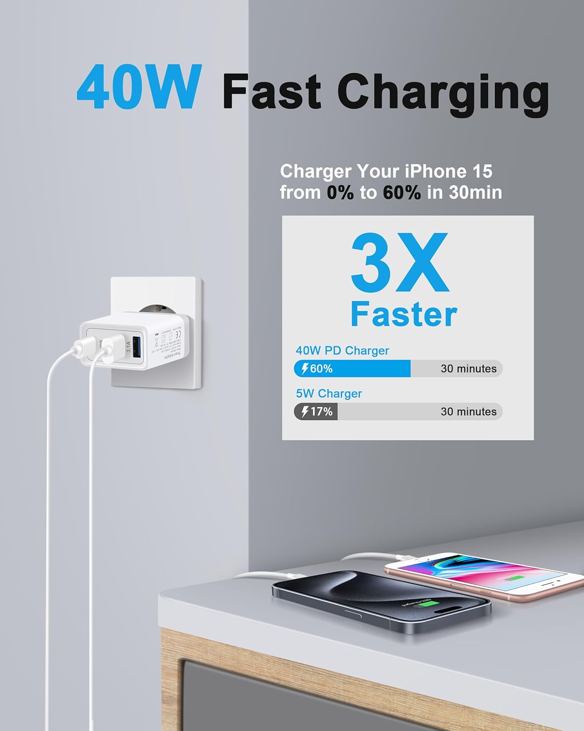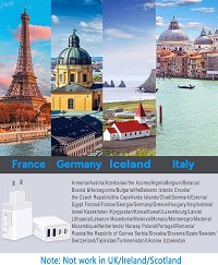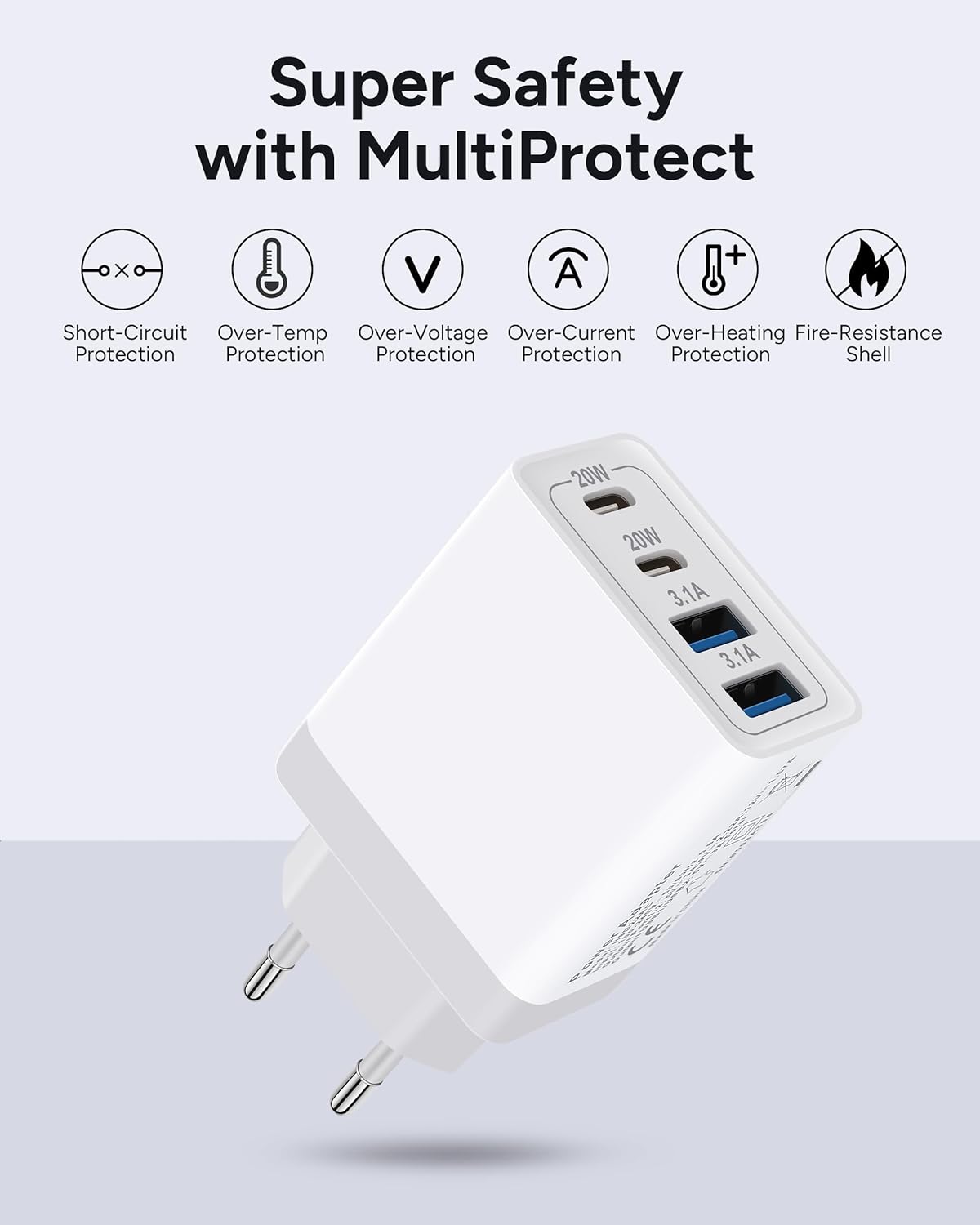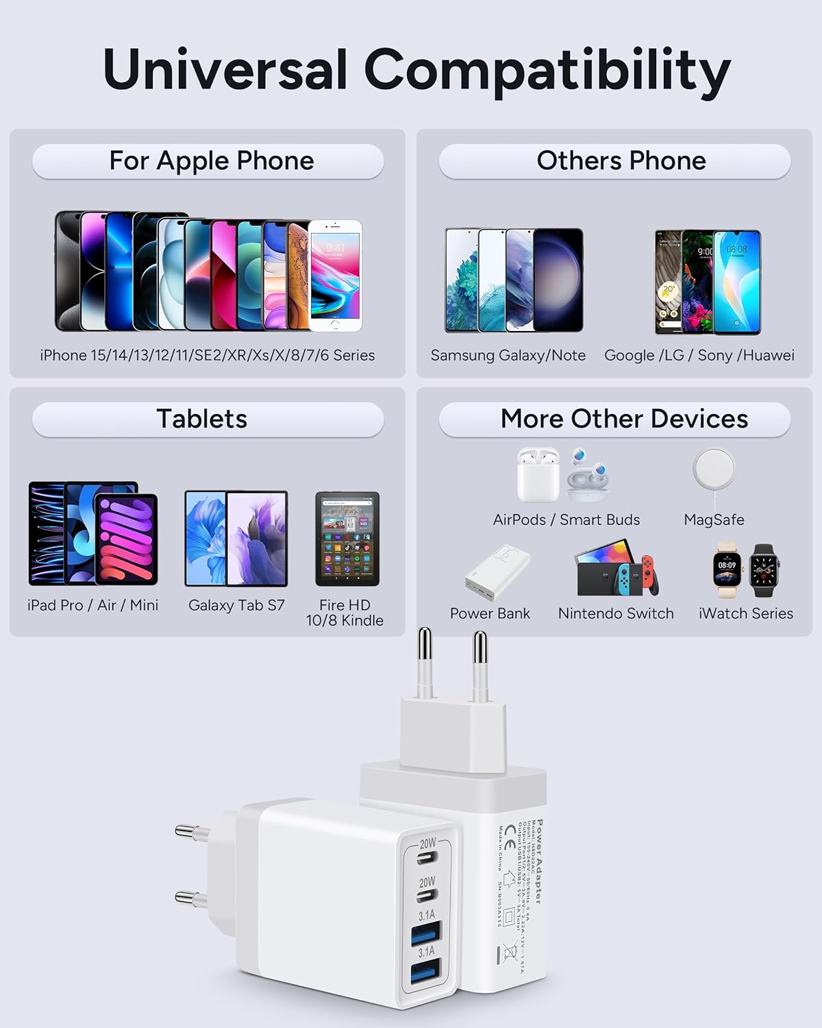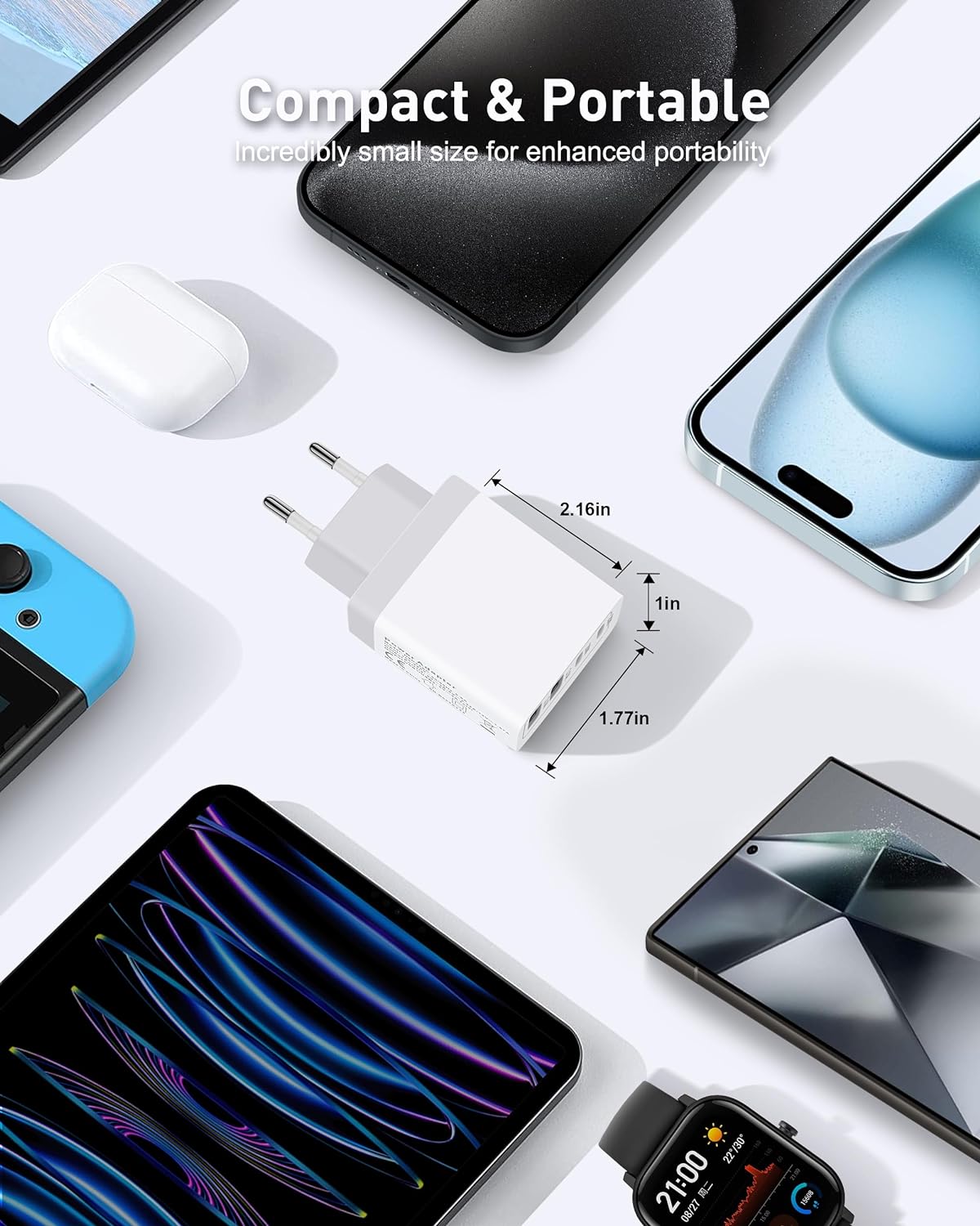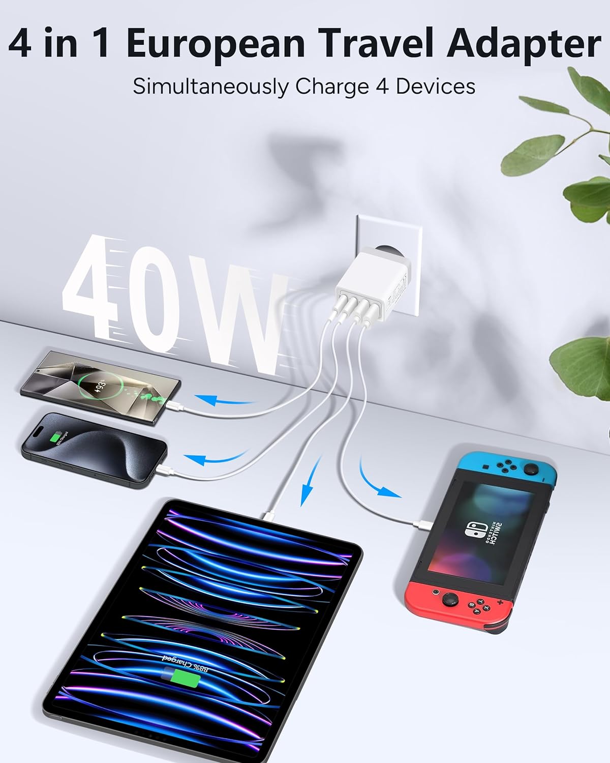 US to Europe Plug Adapter: International power adapter compatible in most European countries such as France, Germany, Italy, Spain, Iceland, Portugal, Poland, Romania, Greece, Turkey, Holland, Finland, Sweden, Belgium, Cyprus, Norway, Luxembourg, Yugoslavia, Serbia, Saudi Austria, Iran, Ukraine, Slovenia, Bosnia and Herzegovina. This European travel plug adapter is compatible for 100V to 250V wide voltage devices. NOTE: Not work in UK/Ireland/Scotland. 40W Fast Charging: The Type C charger supports the PD/QC fast charging functions with total output of the USB C port is 40W. The USB A port provides a power output of 3.1A/5V. Charges your iPhone devices from 0% to 60% in 30 minutes, 3X faster than Original 5W charger. Multiport European Plug Adapter: This European USB C wall charger block is designed with 4-Port (USB-C + USB-A) and USB C each port independently output 20W power, which enable to charge 4 devices simultaneously. When you connect 4 devices, power will be efficiently distributed between ports to ensure you get the best charge to minimize waiting time. It fit for traveler, business men and foreign students use in airports, hotels and dorm room. Universal Compatibility: 4-Port 40W European Travel Plug Adapter is compatible with iPhone 15/15 Plus/15 Pro/15 Pro Max/14/14 Plus/14 Pro/14 Pro Max/13/13 Pro Max/12/12 Mini/12 Pro/12 Pro Max/11/11 Pro Max/XS/XR/X/8/7/6/6S Plus/SE, iPad Pro 12.9/11 inch, iPad Air 5/4/3, iPad Mini, AirPods Pro, Watch. Google Pixel 8/7/6/Pro/5, Samsung Galaxy S24/S23/S22/S21/S20 Ultra, Note 20 /10/9, Moto, LG, Android Phones and other digital devices. Compact Design: Europe Travel Plug Adapter with 8.8oz weight, portable size, can be easily carried in your pocket, effectively saving space of your suitcase, back pocket, handbag and convenient to carry. 2-Pack 40W 4-Port European Europe EU USB C Wall Charger Block (White).
