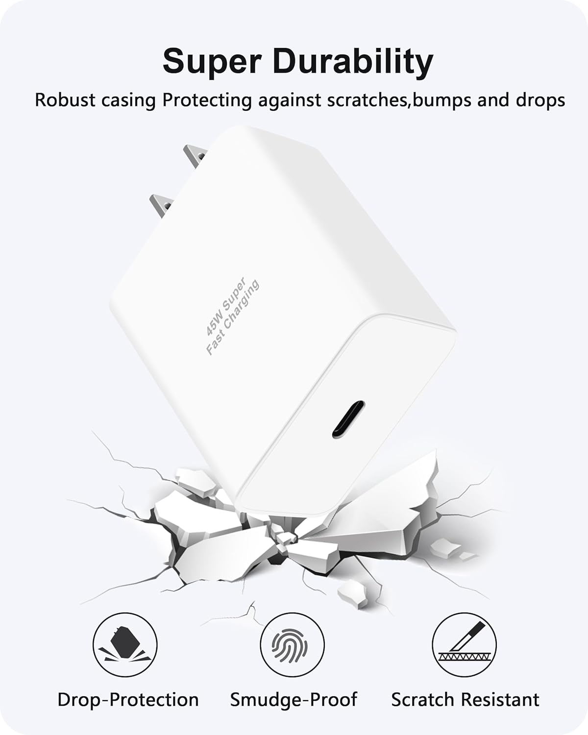 45W Super Fast Charging: USB C charger block adopts PD super fast charging protocol to provides 45W max power output for Google Pixel Phones/Pixelbook. Power up for your Pixel 9 Pro to 70% battery in about 30 minutes, 4X Faster than 10W charger 6FT USB C to C Cable: The 6 Foot type c charger cord supports 60W fast charging and 480Mbps data sync transfer speed. The 6ft long length cable allows you to use phones in the sofa, bedroom and even the back seat of the car Widely Compatibility: The 45W Type C super fast wall charger compatible with all your Google Pixel devices, including for Pixel Phones, Pixel Buds, Pixel Tablet, Laptop. Compatible with Google Pixel 9/9 Pro/9 Pro XL/9 Pro Fold/8/8a/8 Pro/7/7a/7 Pro/6/5/4 XL, Pixel Tablet, Pixel Slate, Pixelbook Go, Pixelbook, Samsung Galaxy S24/S23/S22 Ultra, Android Phone and more Safe and Reliable: 45W USB C pixel fast charger built-in multiple safety protection system to prevent from over-heating, over-charging, over-current and short circuit. The type c charger will automatically stop charging when power is full to protect the safety of your device What You Get: 1 x 45W USB C Wall Charger Block, 1 x 6FT USB C to USB C Charging Cable