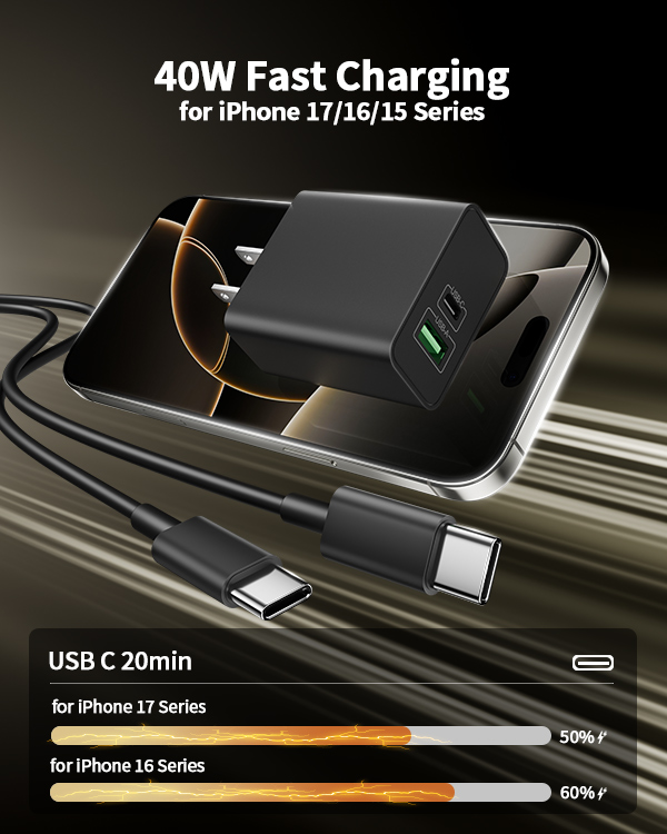 45W Fast Charging for iPhone 17: WODENTA USB C charger block adopts the 2025 upgraded PD 3.0 fast charging technology, with a maximum output power of 45W. Charge for your iPhone 17 series up to 50% in just 20 minutes. It can also fast charge for your iPad, Watch, AirPods, Android Phones, and other USB-C devices Dual-Port Simultaneous Charging: This 45W iPhone 17 fast charging block is equipped with USB-C and USB-A ports and can charge your iPhone and iPad series two devices simultaneously, helping you work efficiently. The 45W dual-port USB C power adapter offers fast and efficient charging at home, in the office or on the go 6FT iPhone 17 Charger Cord: This USB-C cable supports PD3.0 fast charging with a maximum output power of 60W (20V/3A) and data transfer speed of up to 480Mbps. The 6-foot extra long length design makes it convenient for you to charge from a distance on the sofa, in the bedroom, in the office, or even while playing entertainment videos and games Widely Compatibility: The 45W USB-C & USB-A wall charger is compatible with mobile phones, tablets, laptops, smart watches, and other USB-C and USB-A devices. compatible with iPhone 17/17 Air/17 Pro/17 Pro Max/16/16 Plus/16 Pro/16 Pro Max/16e/15/15 Plus/15 Pro/15 Pro Max, iPad Pro 13/12.9/11 inch, iPad Air 6th/5th/4th, iPad Mini 6th, iPad 10th Generation/A16, Samsung Galaxy S25/S24/S23/S22/S21, Moto, Pixel, LG, Android and more What You Get: 2 x 45W Dual Port USB C Wall Charger Block (Black), 2 x 6FT USB C to USB C Cable (Black). Carry a 45W fast USB-C charger kit with you to make you don't run out of power when you need it most