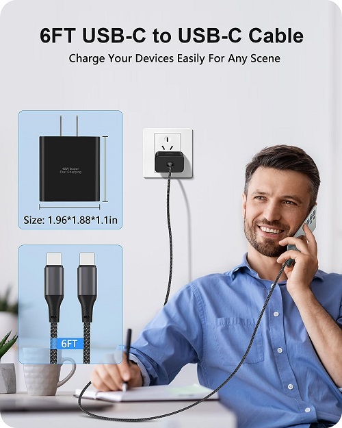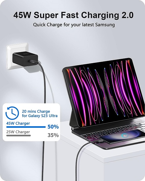 【45W Samsung Super Fast Charger】45W Type C Fast Charger adopts latest PPS (Programmable Power Supply) fast charging protocol to provides 45W Max output power for Samsung devices. Super fast charge for Samsung Galaxy S23/S22 Ultra from 0% to 50% in just 20 minutes, more faster than other 25W/15W chargers. 【6FT Long USB C to USB C Cable】The android phone charger block kit is equipped with 60W USB-C to USB-C cable, 480Mbps sync data and transfer files, and you can use any other USB C charger to charge your mobile phone, tablet and laptop. The 6ft long designed allows you to use phones in the sofa, bedroom and even the back seat of the car. Use reinforced nylon woven jacket material to ensure that metal parts will not break, 20000+bending life test. 【45W USB C Fast Charger Compatibility】45W Super fast charging 2.0 max compatible with Samsung Galaxy S23, S23+, S23 Ultra, S22, S22+, S22 Ultra, Note 10+, A91 and more latest models. 25W Super fast charging 1.0 max compatible with Samsung Galaxy S21, S21+ 5G, S21 Ultra, S20, S20+, S22 Ultra, S20 FE, Note 10/Note 10 5G, Galaxy Z Flip 4/Z Fold 4, Galaxy Z Fold 3 5G, A90 5G, A80, A70, Tab S8/S8+/S8 Ultra/S7+/S7 and more. 【Safe & Reliable】45W Type C Fast charging blocks built-in smart chip and multi-protect system, protect your devices against over-voltage, over-current, over-heating and short-circuit, ensure your devices safety. Portable and compact designed, easy to carry, suitable for travel and family. 【What You Get】2 X 45W USB C Wall Charger Block, 2 X 6FT Long USB-C to USB-C Fast Charging Cord, and 24h/7d friendly customer service.