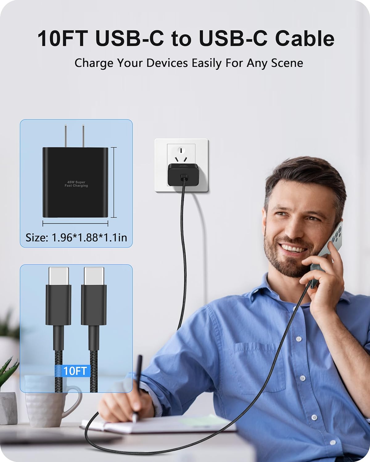 [45W Samsung Fast Charger] USB C charger block power adapter equipped with PD 3.0 fast charging technology, provide max 45W output power. Fast charge your Samsung Galaxy S24 / S23 / S22 Ultra up to 50% in just 20 minutes, 3X Faster than your 15W old charger. [10FT Extra Long USB C to C Cable] The Android phone charger cable supports 60W/3A fast charging and up to 480Mbps data sync transfer speed. 10FT ultra-long design, providing longer charging distance, convenient for you to use phone charging in the sofa, bedroom, office. Use new nylon braided sheath material designed to ensures that the internal metal parts will not break, 20000+ bending test, stronger durability and longer service life. [Wide Compatibility] 45W Type C super fast charger kit compatible with Samsung Galaxy S24, S24+, S24 Ultra, S23, S23+, S23 Ultra, S22, S22+, S22 Ultra, S21, S21+, S21 Ultra, S21 FE, S20, S20+, S20 Ultra, S20 FE 5G, S10, S9, S8 Plus, Note 20 Ultra, Note 20, Note 10, Z Flip4, Z Fold4, Z Fold3, Z Flip3, A71, A80, A90, A53, A52, A23, Galaxy Buds2 Pro, W23 Flip / W23 / W22, Pixel 8 / 7 / 6 / 5, LG G8 G7 G6 V50 V40 V30, Moto, Android Phones and more. [Superior Safety] This Samsung Galaxy S24/S23 charger has multiple built-in safety protection systems to protect your device against short circuits, over-current, overcharge and overheating issues. Smart IC chips can automatically identify and detect the type of phone and battery status, automatically stop charging when the battery is fully charged to ensure the safety of your device. [What You Get] 2-Pack 45W Super Fast Wall Charger Type C Charging Block, 2-Pack 10FT Nylon-Braided USB C to USB C Cable Android Phone Charger Cord.