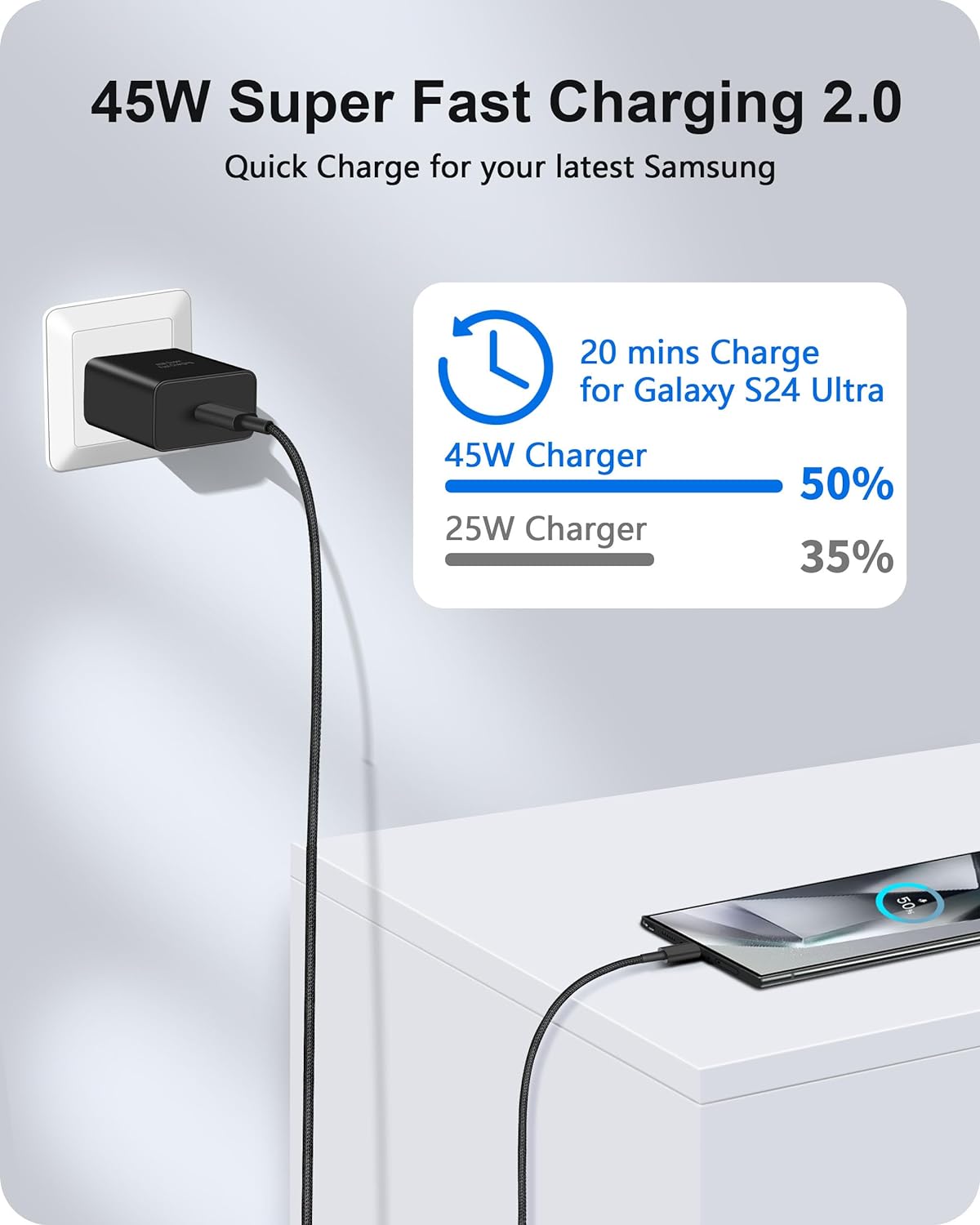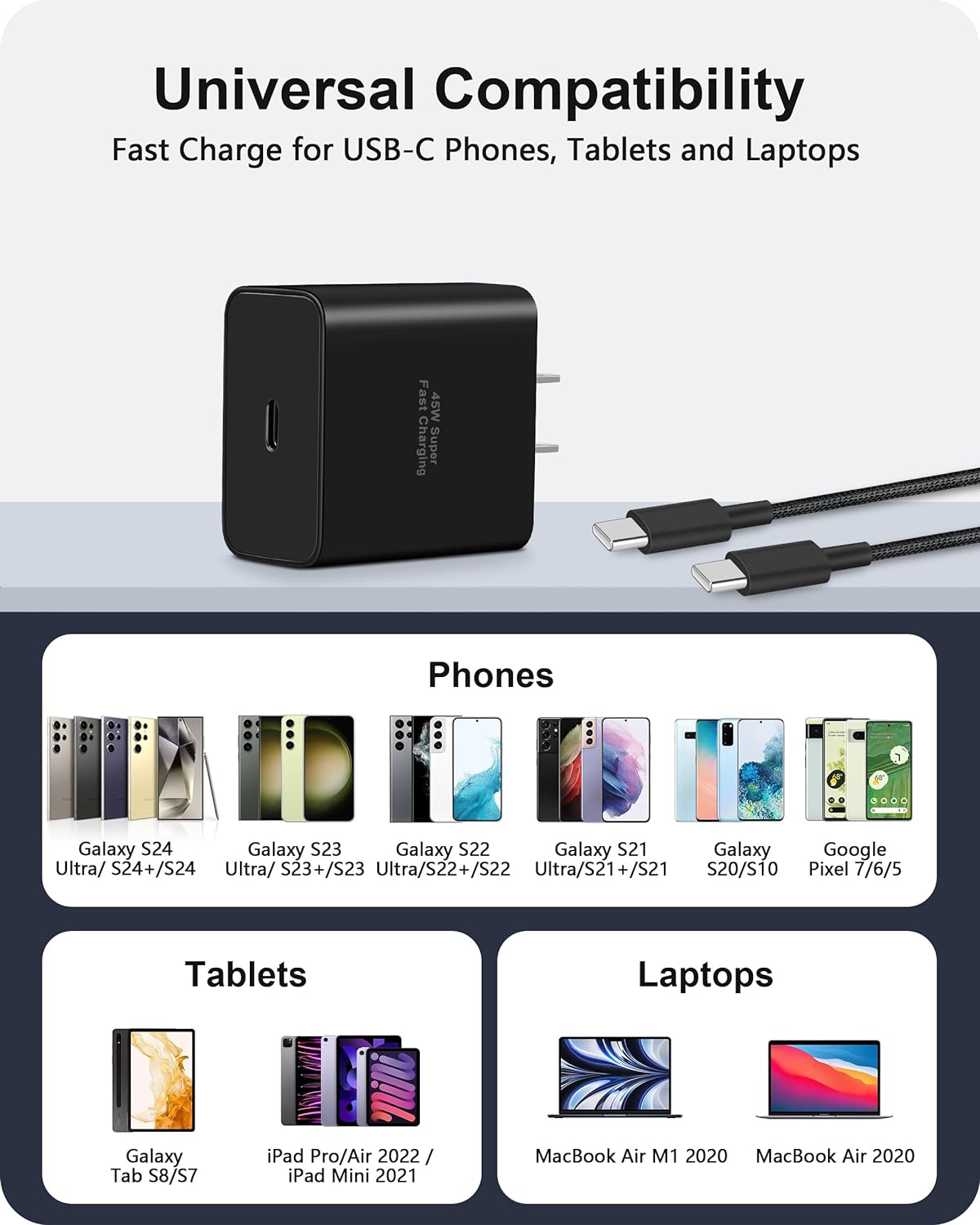 [45W Samsung Fast Charger] USB C charger block power adapter equipped with PD 3.0 fast charging technology, provide max 45W output power. Fast charge your Samsung Galaxy S24 / S23 / S22 Ultra up to 50% in just 20 minutes, 3X Faster than your 15W old charger. [3FT Extra Long USB C to C Cable] The Android phone charger cable supports 60W/3A fast charging and up to 480Mbps data sync transfer speed. 3FT cable convenient for you to use phone charging in the sofa, bedroom, office. Use new nylon braided sheath material designed to ensures that the internal metal parts will not break, 20000+ bending test, stronger durability and longer service life. [Wide Compatibility] 45W Type C super fast charger kit compatible with Samsung Galaxy S24, S24+, S24 Ultra, S23, S23+, S23 Ultra, S22, S22+, S22 Ultra, S21, S21+, S21 Ultra, S21 FE, S20, S20+, S20 Ultra, S20 FE 5G, S10, S9, S8 Plus, Note 20 Ultra, Note 20, Note 10, Z Flip4, Z Fold4, Z Fold3, Z Flip3, A71, A80, A90, A53, A52, A23, Galaxy Buds2 Pro, W23 Flip / W23 / W22, Pixel 8 / 7 / 6 / 5, LG G8 G7 G6 V50 V40 V30, Moto, Android Phones and more. [Superior Safety] This Samsung Galaxy S24/S23 charger has multiple built-in safety protection systems to protect your device against short circuits, over-current, overcharge and overheating issues. Smart IC chips can automatically identify and detect the type of phone and battery status, automatically stop charging when the battery is fully charged to ensure the safety of your device. [What You Get] 2-Pack 45W Super Fast Wall Charger Type C Charging Block, 2-Pack 3FT Nylon-Braided USB C to USB C Cable Android Phone Charger Cord.